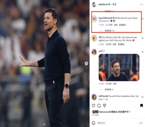 体育播报01月13日宣 今日哈维·阿隆索在社媒告别了皇马,勒沃库森官推在他的帖文下评论:祝你未来一切顺利