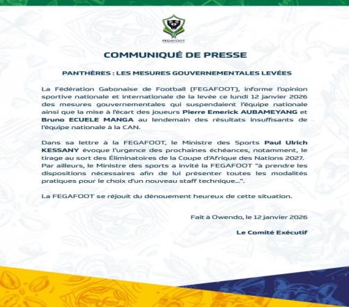 加蓬足协向国内外体育界通报,2026年1月12日星期一,政府已解除此前因国家队在非洲杯表现不佳而采取的暂停国家队活动及将奥巴梅扬和布鲁诺·曼加两名球员除名的措施。