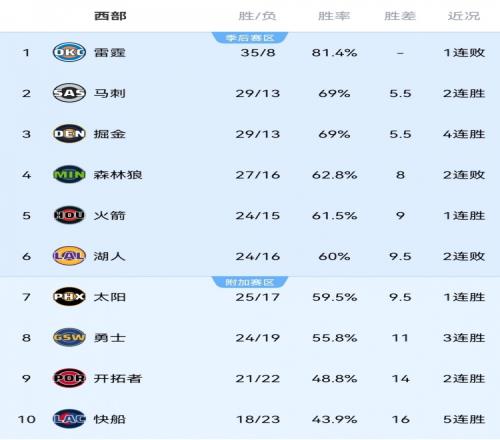 附加赛在招手湖人与同分区太阳胜场差抹平胜率更高暂列西部第6