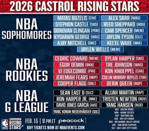 北京时间1月27日,NBA官方公布了2026年全明星新秀赛的完整名单,其中有21人是一年级或二年级新秀,另外7人是在发...