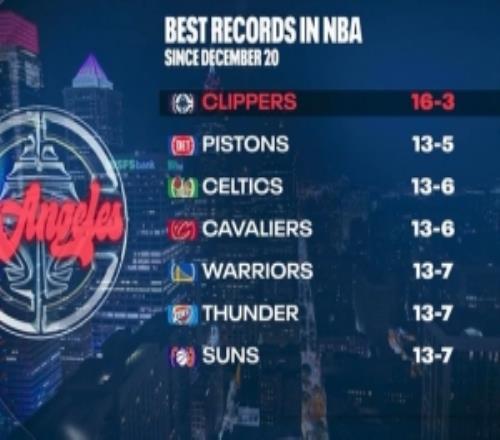 12月20日以来快船16胜3负联盟最佳第二的活塞“仅”13胜5负