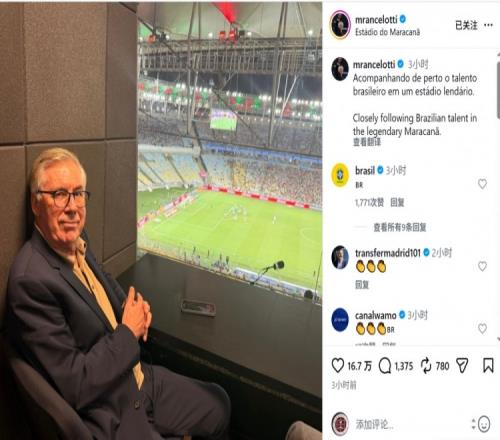 安切洛蒂来到马拉卡纳球场,观看弗鲁米嫩塞对阵格雷米奥的巴甲比赛,为国家队考察球员,他在社交媒体上晒出观赛照片,配文:“在传奇的马拉卡纳球场密切关注巴西人才。”
